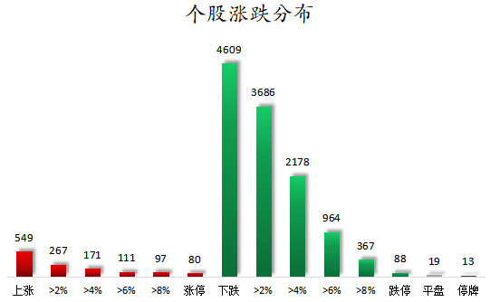 个股涨跌情况,截至收盘,沪深两市合计549只个股上涨,4609只个股下跌,平盘个股19只,停牌的个股13只。不含当日上市新股,共有80只个股涨停,88只个股跌停。