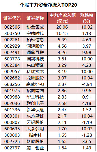 个股来看,今日有1495只个股获主力资金净流入,其中,50股获主力资金净流入超1亿元。协鑫集成主力资金净流入最多,净流入金额为20.06亿元;主力资金净流入居前的个股还有宁德时代、拓维信息、润建股份、通鼎互联、国晟科技等,净流入金额分别为10.15亿元、5.39亿元、4.56亿元、4.26亿元、3.61亿元。