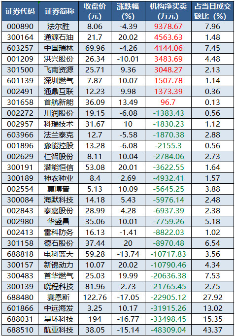 盘后龙虎榜数据显示,今日机构席位资金合计净卖出约23.56亿元。其中,净买入的个股8只,净卖出的个股21只。机构净买入最多的股票是法尔胜,净买入金额约9378.67万元;机构净买入居前的还有通源石油、中国瑞林等股。机构净卖出最多的股票是航亚科技,净卖出金额约4.83亿元;机构净卖出居前的还有星环科技、中远海发、赛恩斯等股。