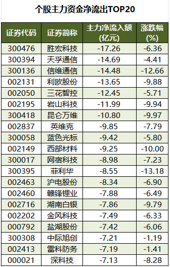 今日有3682只个股被主力资金净卖出,其中,360股被主力资金净卖出超1亿元。主力资金净流出最多的个股是胜宏科技,净流出金额为17.26亿元;主力资金净流出居前的个股还有天孚通信、信维通信、利欧股份、三花智控、岩山科技等,净流出金额分别为14.69亿元、14.48亿元、13.65亿元、12.45亿元、11.99亿元。