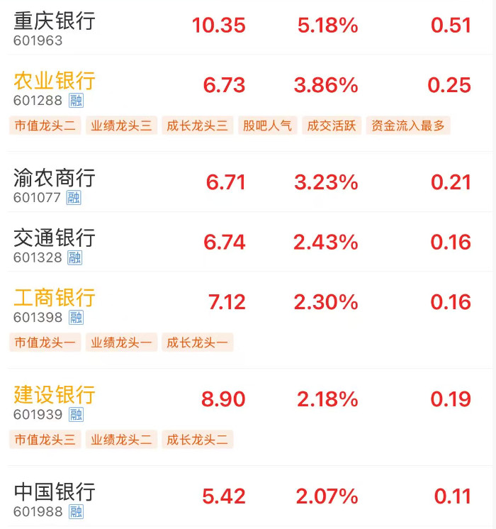 [环球网财经综合报道]3月3日银行板块表现抢眼,重庆银行领涨,农业银行、渝农商行、交通银行、工商银行、建设银行、中国银行涨幅超2%。